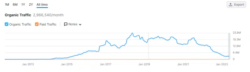 Specifically, keep an eye on the years 2017 and 2021, as these were pivotal periods when significant changes occurred. The screenshots were taken from Semrush, but other tools show the same or similar traffic patterns.